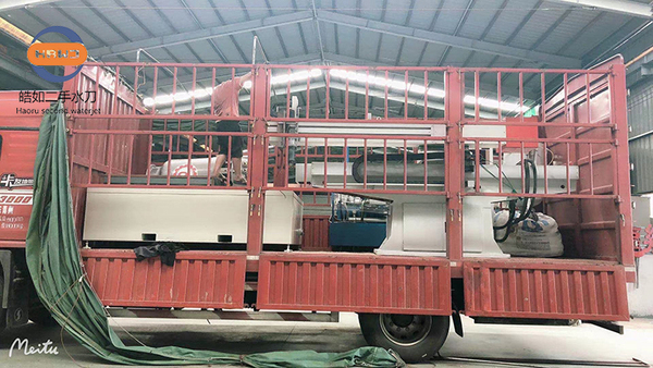 水刀,就是以水为刀,通过将水在容器内增压到超高压,再经过极小的喷嘴射出高压水流,从而实现对材料的切割;为了增加切割能力,还会将一些石榴砂,金刚石等磨料添加在水中,是一种现在广泛使用的切割方式。皓如二手水刀